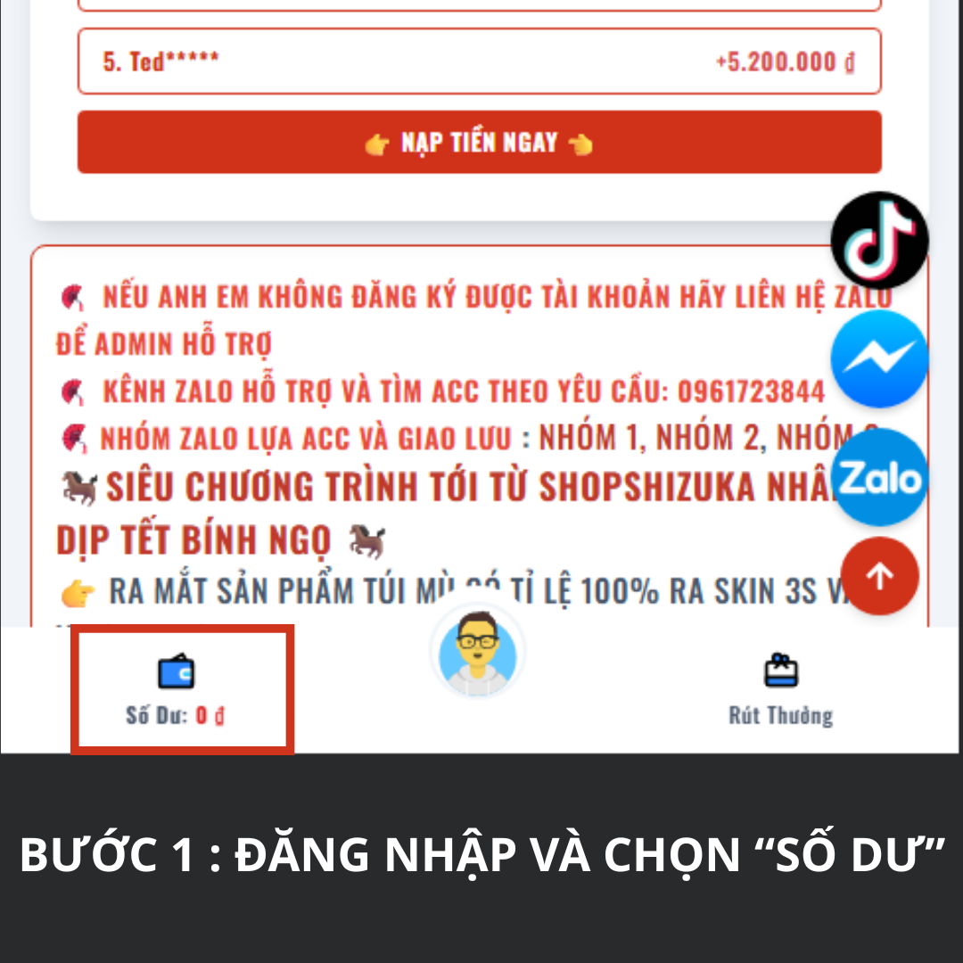Sau khi đăng nhập tài khoản tại ShopShizuka.com, bạn chọn mục “Số dư” ở phía dưới màn hình.